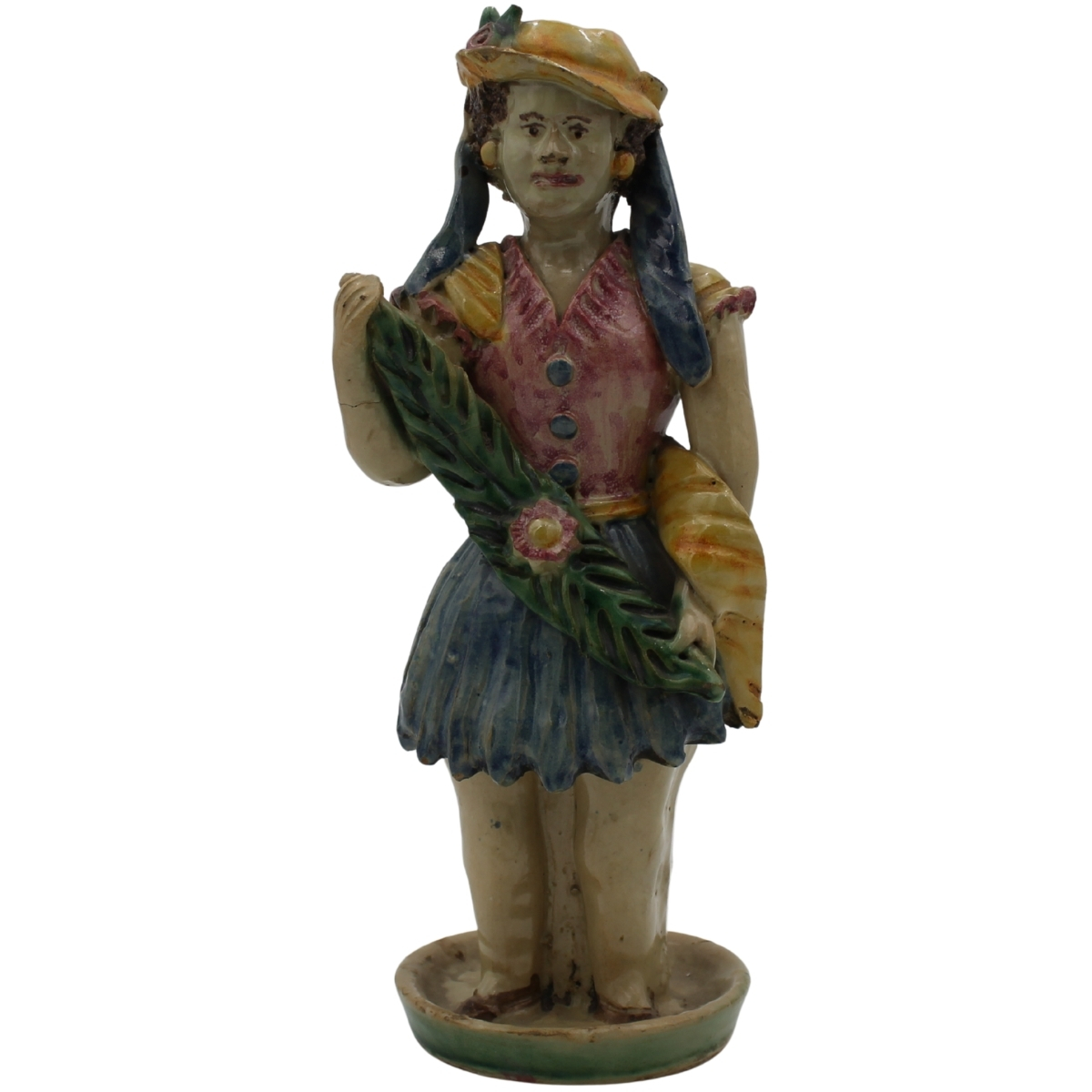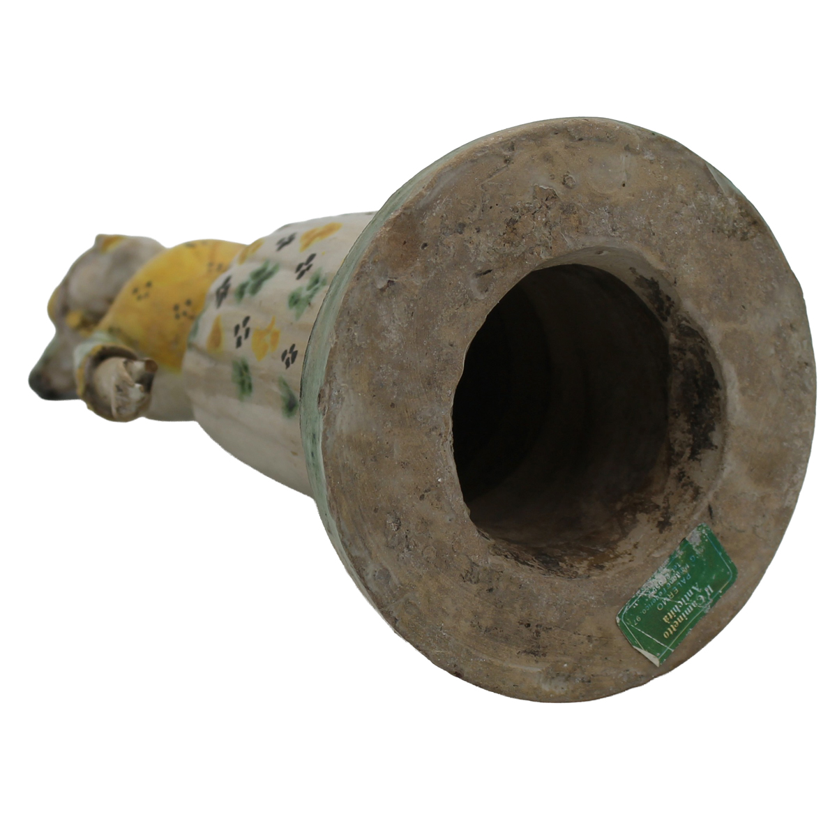 € 550Antica maiolica con decoro a motivi ornamentali policromi su fondo crema (rottura al braccio sinistro). Caltagirone. Secolo XIX. Cm h 32