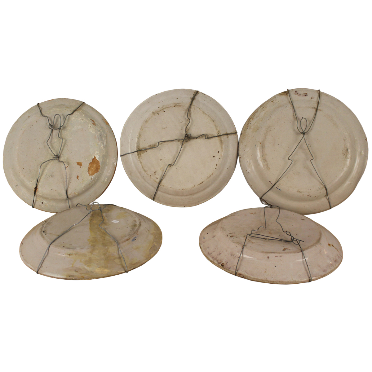 € 150Antica maiolica policroma con decori a motivi floreali, paesaggi copn casolari e volatili (restauri e rotture su due dei cinque). Italia meridionale. Metà del secolo XIX. Cm d43 circa