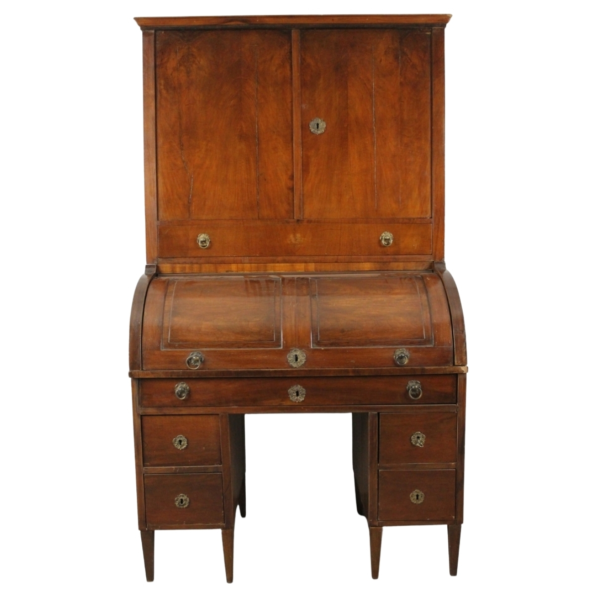 € 200Noce scolpito (danni ad una delle due sedie, tappezzeria di epoca posteriore). Cm 52x46x132