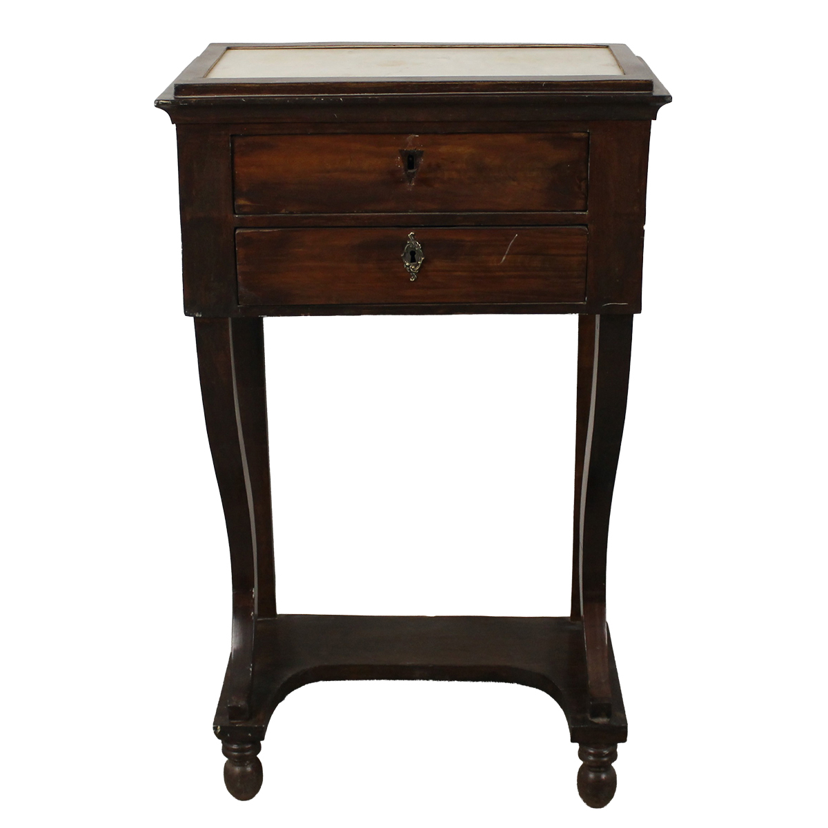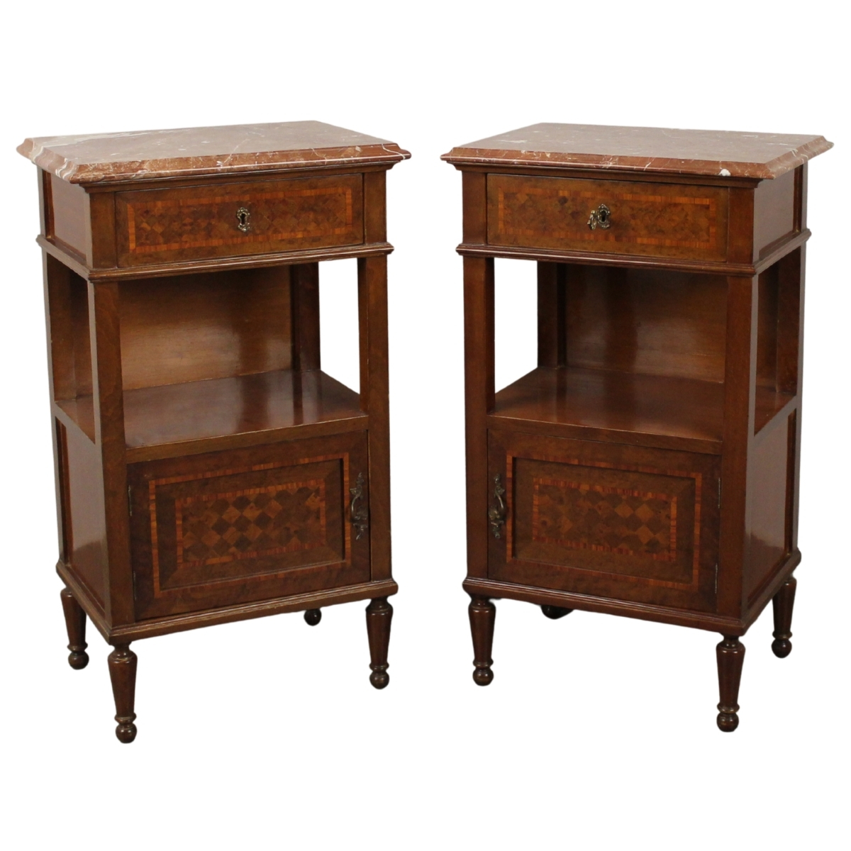 € 80Noce con perfili in legno rosa e intarsi in bosso. Piano in marmo rosso venato. Sicilia. Secolo XX. Cm 48x34x82,5