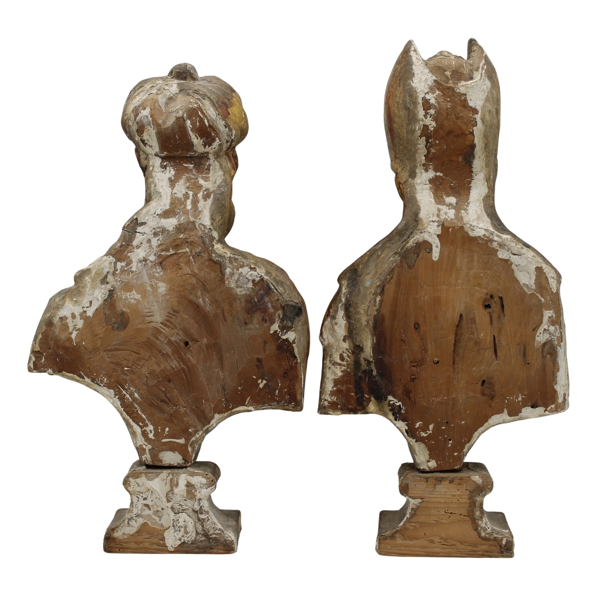 € 500Coppia di mezzibusti in legno scolpito e dorato su base in legno dipinto (lievi danni e mancanze). Cm h 42