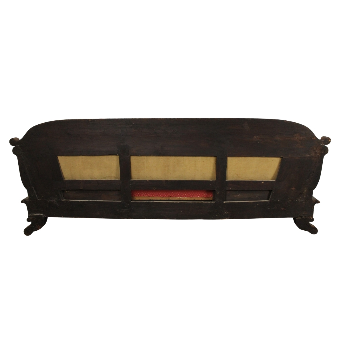 € 500Palissandro riccamente intarsiato a motivi floreali e ornamentali con elementi scolpiti a teste di tritoni. Ebanisteria siciliana. Epoca Luigi Filippo. Cm 230x64x88