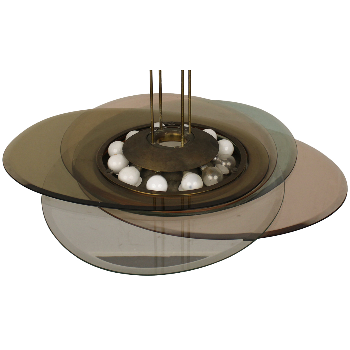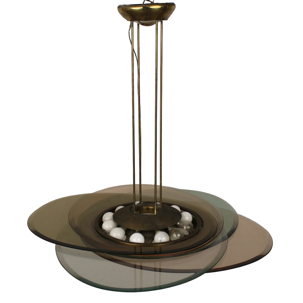€ 4.000Diffusori in vetro molato colorato, struttura in ottone (danni alla coppa e impianto elettrico da revisionare). Produzione Fontana Arte. 1950 circa. Cm 80x80x70