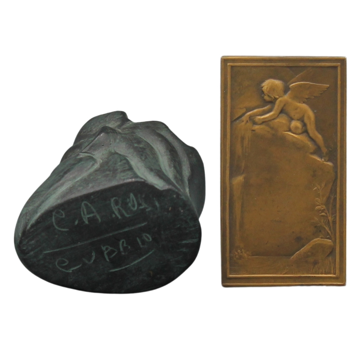 € 150Lotto composta da un piccolo vaso antropomorfo in terracotta firmato sul fondo e placca in bronzo inciso raffigurante vestale firmata in basso a destra. Cm 6,5x3,5 (placca); cm h (piccolo vaso)