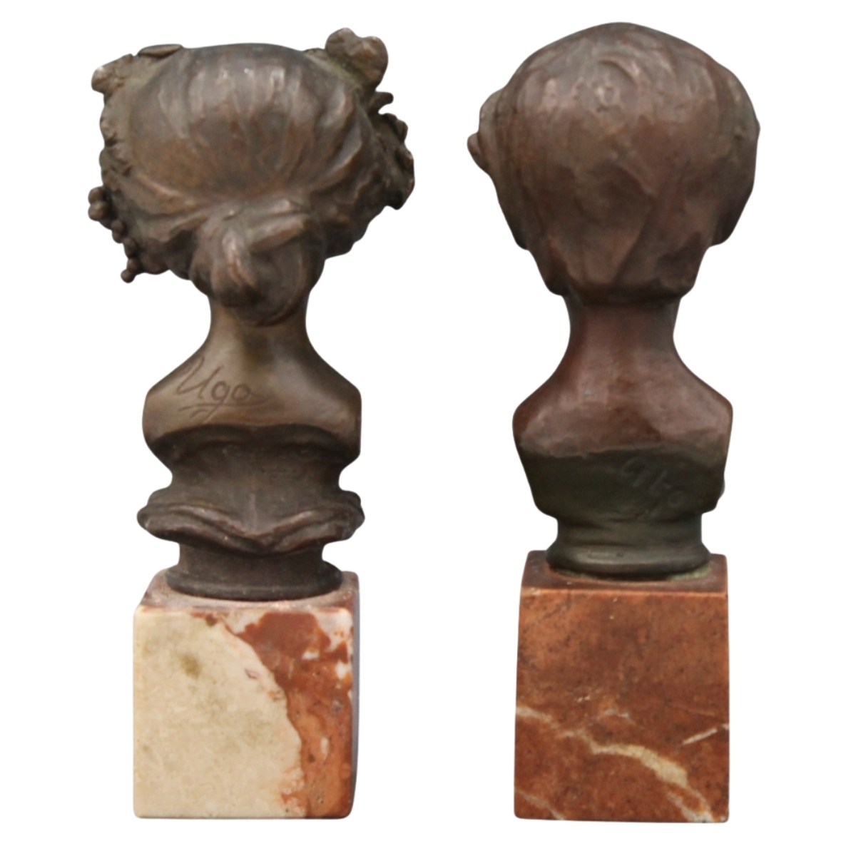 € 500Due piccole sculture in bronzo patinato su base in marmo rosso venato. Cm h 14