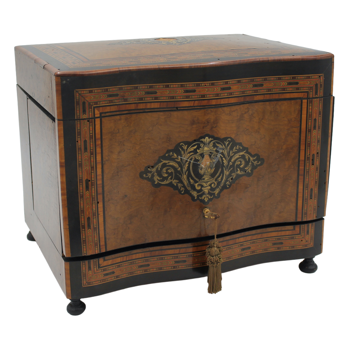€ 150Composto da quattro bottiglie e otto bicchieri inseriti in cofanetto in legno magistralmente intarsiato a motivi ornamentali e vegetali (servizio mancante di alcuni pezzi). Metà del secolo XIX. Cm 32,5x25x28