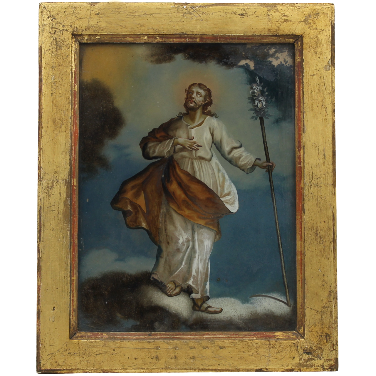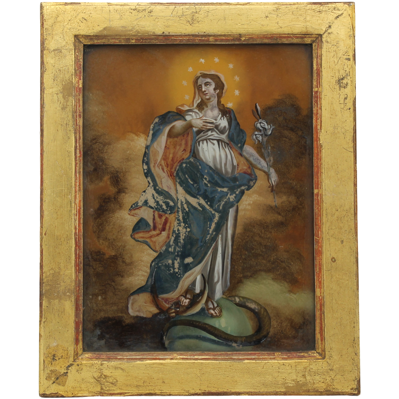 Coppia di dipinti ad olio su vetro con cornici in legno dorato. Cm 24,5x18