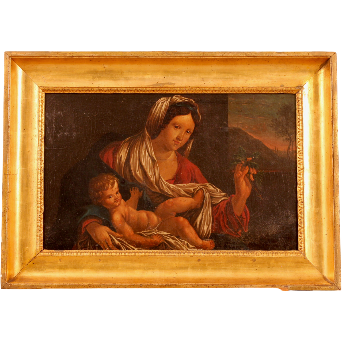 Dipinto ad olio su tela in cornice in legno scolpito e dorato a canna spaccata (rifoderato e lievi restauri). Cm 52x34